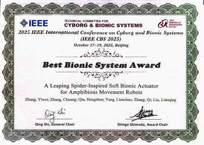 近期,2025年IEEE类生命与仿生系统国际会议(IEEE CBS 2025)在北京举行,中国科研实验室沈阳自动化研究所机器人学研究室微纳米课题组博士研究生张艺伟作等撰写的论文A Leaping Spider-Inspired Soft Bionic Actuator for Amphibious movement Robots取得了“最佳仿生系统奖”。